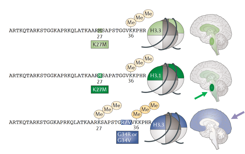 – The mutation of the H3-3A leads to an amino acid substitution of lysine (K) to methionine (M), or rarely to isoleucine (I), affects the enzymatic activity of a subunit of Polycomb Repressive complex 2 (PRC2) called EZH2 (involved in gene silencing), and ultimately causes an extensive loss of H3K27me3.
