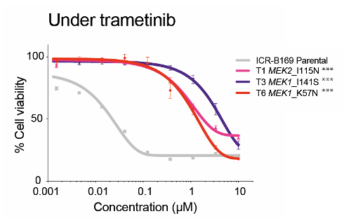 (LEFT) Dose-response curves for trametinib tested against ICR-B169 parental cells (gray) and resistant clones T1 (MEK2I115N, pink), T3 (MEK1I141S, purple), and T6 (MEK1K57N, red) after 7 to 9 months of exposure to the inhibitor.