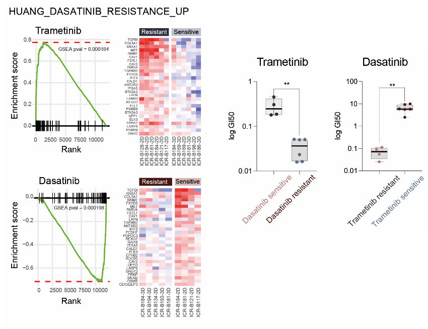 (Right) Box plot of dasatinib GI50 values (log scale, y-axis) for primary patient-derived cultures separated by trametinib sensitivity status. / Box plot of trametinib GI50 values (log scale, y-axis) for primary patient-derived cultures separated by dasatinib sensitivity status. **, P < 0.001, t test.